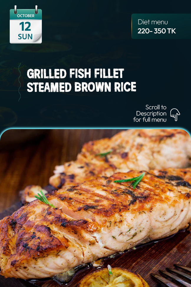 Diet Regular | Grilled Fish Fillet Steamed Brown Rice Fresh Salad Roasted Nut Mouth Freshener |