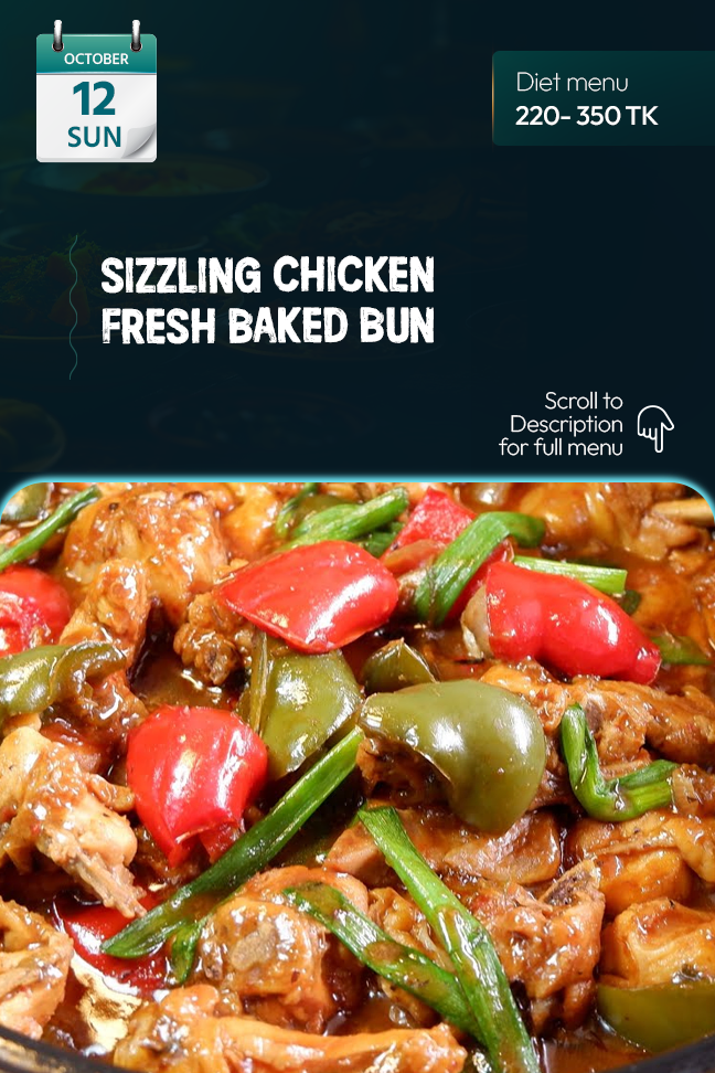 Diet Regular - Alternative Menu | Sizzling Chicken Fresh Baked Bun Fresh Salad Roasted Nut Mouth Freshener |