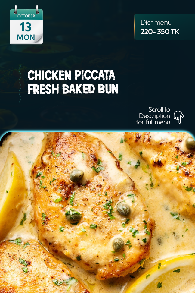 Diet Regular - Alternative Menu | Chicken Piccata Fresh Baked Bun Fresh Salad 150gm Roasted Nut Mouth Freshener |