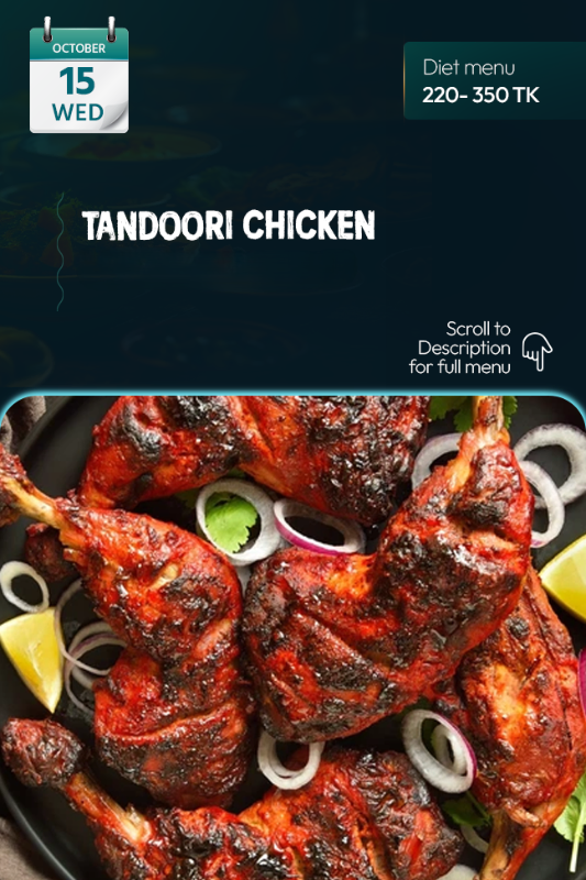 Diet Regular | Tandoori Chicken Baked Naan Fresh Salad Roasted Nut Mouth Freshener |