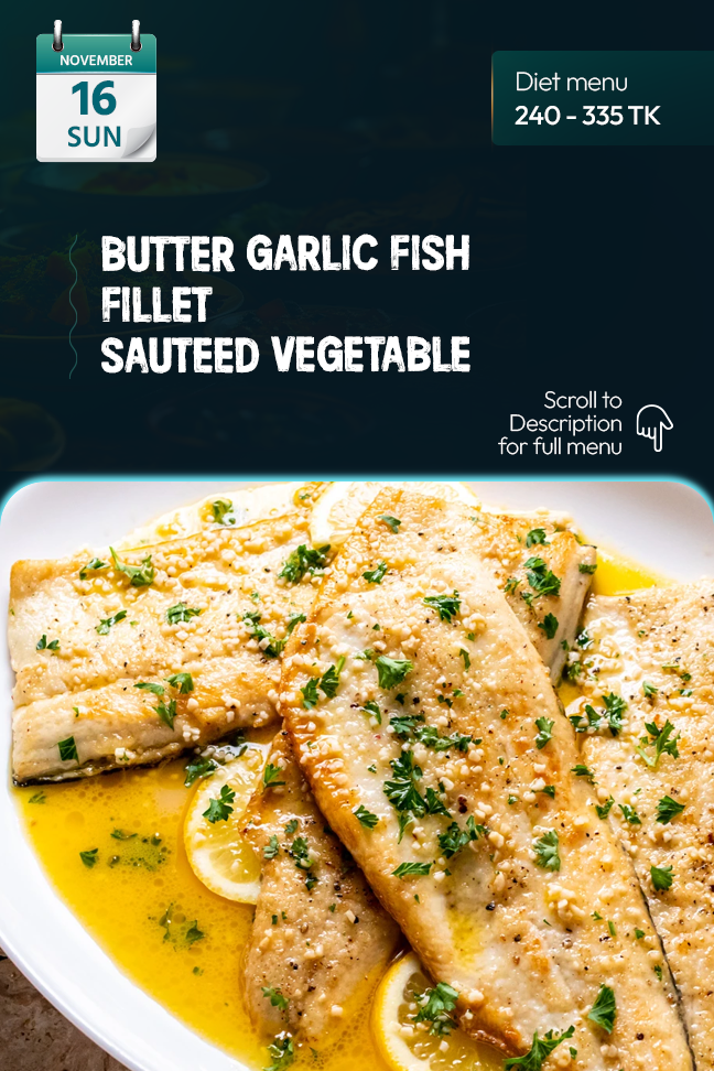 Butter Garlic Fish Fillet Sauteed Vegetable Salad Fresh Baked Bun Nut Pack Mouth Freshener |