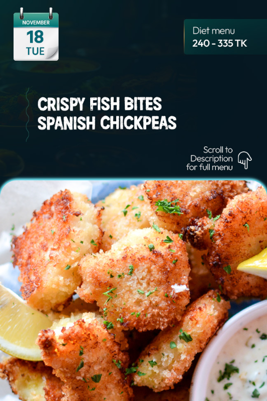 Crispy Fish Bites Spanish Chickpeas Salad Brown Rice Nut Pack Mouth Freshener |