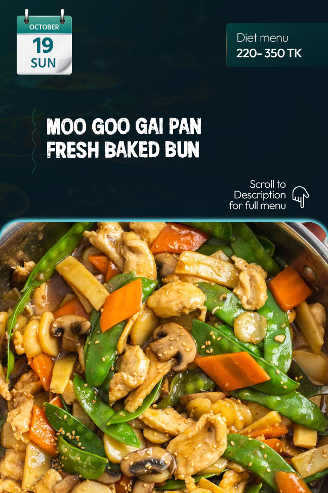 Diet Regular - Alternative Menu | Moo Goo Gai Pan Fresh Baked Bun Fresh Salad Roasted Nut Mouth Freshener |