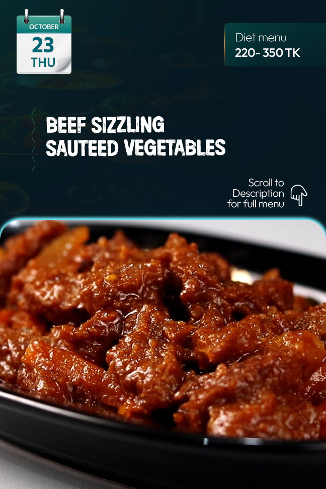 Diet Regular | Beef Sizzling Sauteed Vegetables Steamed Brown Rice Fresh Salad Roasted Nut Mouth Freshener |