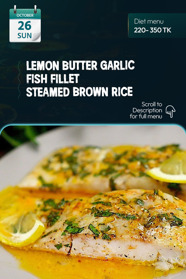 Diet Regular | Lemon Butter Garlic Fish Fillet Steamed Brown Rice Fresh Salad Roasted Nut Mouth Freshener |