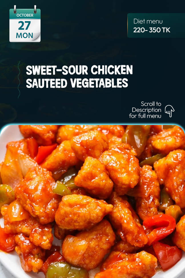 Diet Regular | Sweet & Sour Chicken Sauteed Vegetables Steamed Brown Rice Fresh Salad Roasted Nut Mouth Freshener |