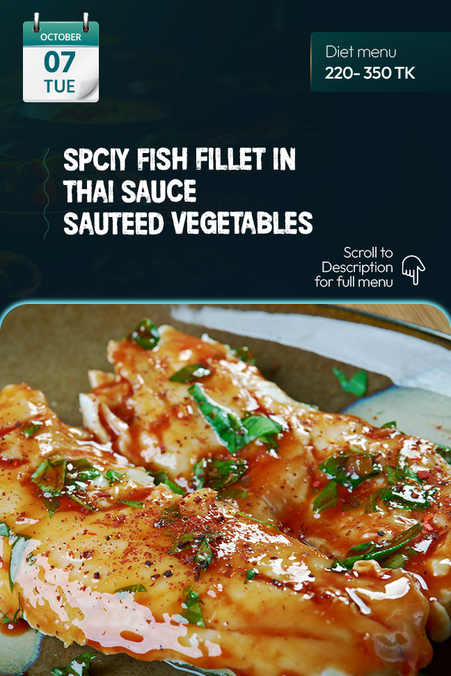 Diet Regular | Spciy Fish Fillet in Thai Sauce Sauteed Vegetables Steamed Brown Rice Fresh Salad Roasted Nut Mouth Freshener |