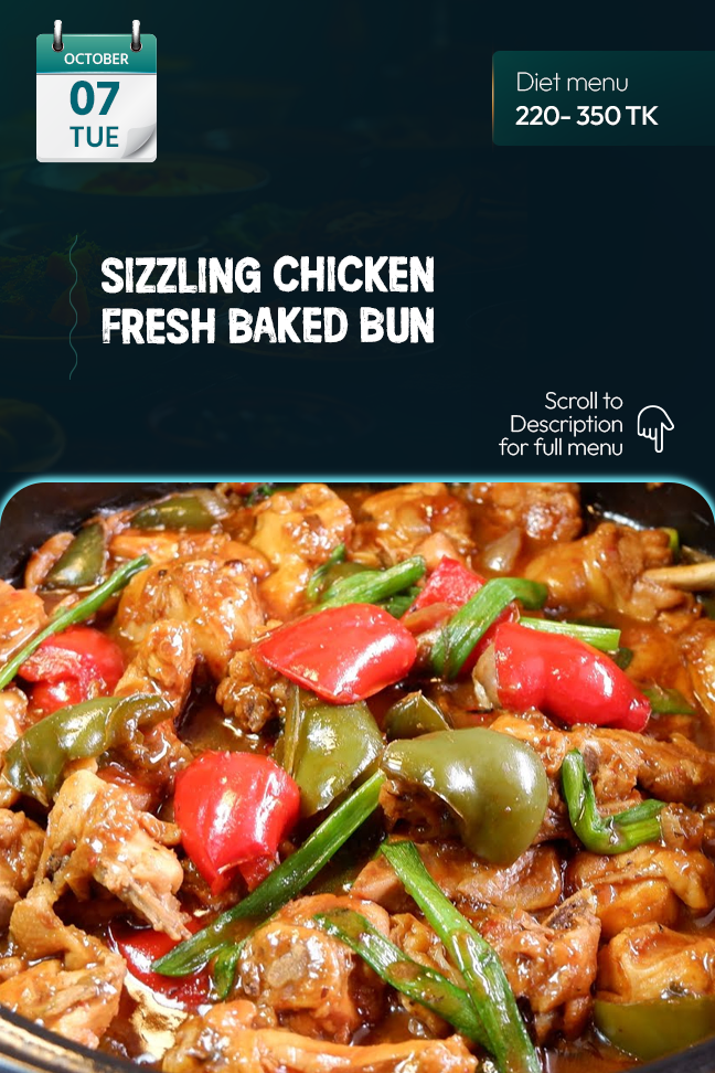 Diet Regular - Alternative Menu | Sizzling Chicken Fresh Baked Bun Fresh Salad Roasted Nut Mouth Freshener |